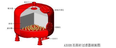 过滤器内多介质滤料为优质均粒砾石、石英砂、无烟煤等滤料,这些滤料根据其比重和粒径的大小在过滤器罐体内科学有序的分布,如比重小而粒径稍大的无烟煤放在滤床的最上层,比重适中和粒径小的石英砂放在滤床的中层,比重大和粒径大的砾石放在滤床的最下层。这样的配比保证了过滤器在进行反洗的时候不会产生乱层现象,从而保证了滤料的截留能力。