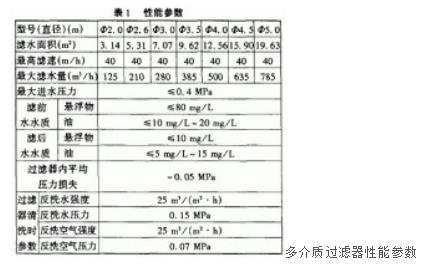 多介质过滤器(滤床),既采用两种以上的介质作为滤层的介质过滤器,在工业循环水处理系统中,用以去除污水中杂质、吸附油等,使水质符合循环使用的要求。过滤的作用,主要是去除水中的悬浮或胶态杂质,特别是能有效地去除沉淀技术不能去除的微小粒子和细菌等,BOD5和COD等也有某种程度的去除效果。性能参数如下表所示: